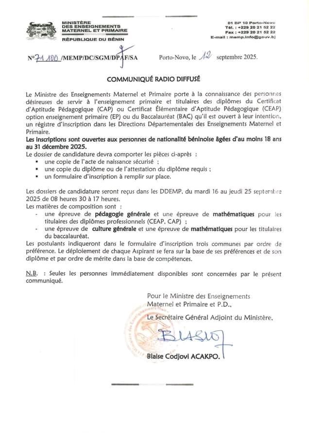 Destinée à renforcer le corps enseignant du primaire, cette initiative s’adresse aux citoyens béninois titulaires du Certificat d’aptitude professionnelle (CAP), du Certificat élémentaire d’aptitude pédagogique (CEAP) option enseignement primaire (EP), ou du Baccalauréat (BAC). Les intéressés sont invités à s’inscrire auprès des directions départementales des enseignements maternel et primaire, dans le strict respect des délais et des exigences administratives énoncées par le ministère.