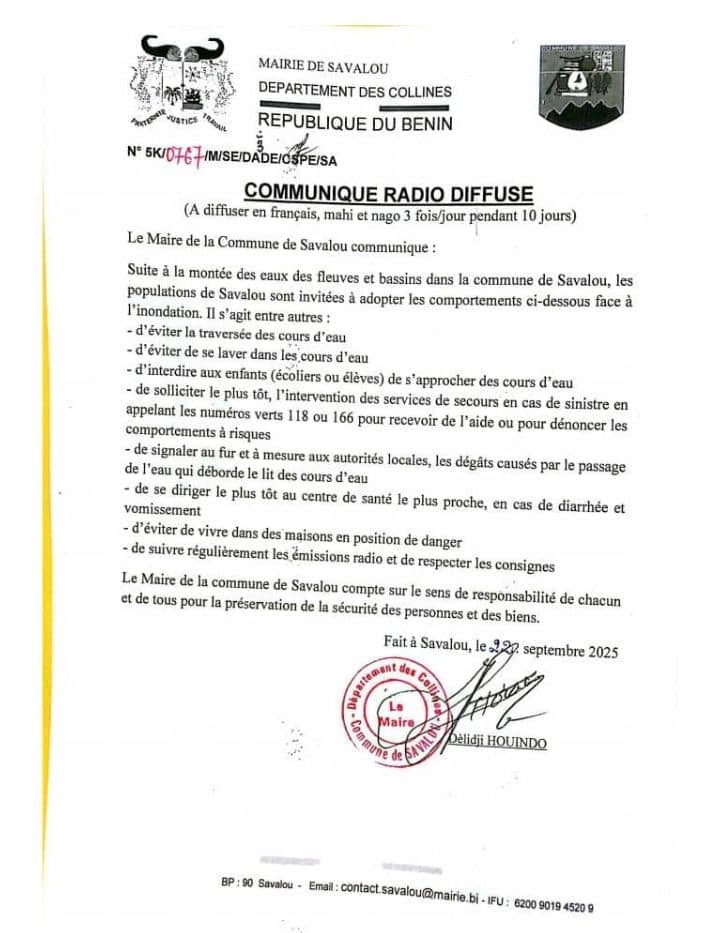 Parallèlement, les services de santé recommandent de consulter immédiatement en cas de diarrhées ou de vomissements, symptômes pouvant indiquer une infection hydrique. Les habitants des zones à risque sont appelés à quitter temporairement leurs logements et à rester à l’écoute des bulletins radio pour suivre l’évolution de la situation. Le maire insiste sur le sens de responsabilité collective, rappelant que la sécurité de tous dépend de la vigilance de chacun.