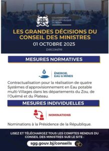 Parallèlement, le Conseil a validé d’autres mesures d’importance, notamment la contractualisation pour la réalisation de quatre systèmes d’approvisionnement en eau potable multi-villages dans les départements du Zou, de l’Ouémé et du Plateau. Ces investissements témoignent de la constance de l’action gouvernementale en faveur de l’amélioration des infrastructures sociales essentielles.