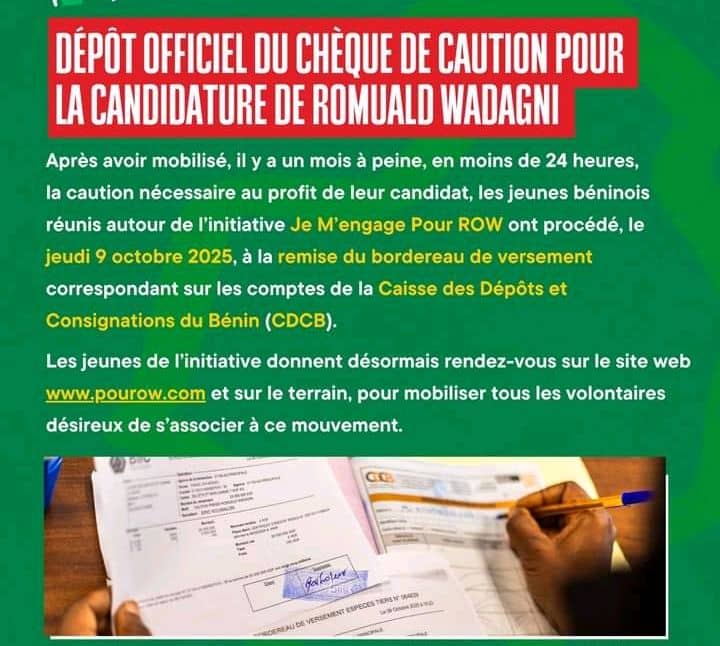 Ce jeudi 9 octobre 2025, l’initiative citoyenne Je M’engage Pour ROW a franchi une étape décisive en déposant officiellement le bordereau de versement de la caution de M. Romuald Wadagni auprès de la Caisse des Dépôts et Consignations du Bénin. Cette démarche concrétise l’engagement rapide et massif des jeunes Béninois, qui, en moins de vingt-quatre heures, avaient mobilisé la somme requise, dépassant les 30 millions de francs CFA.
