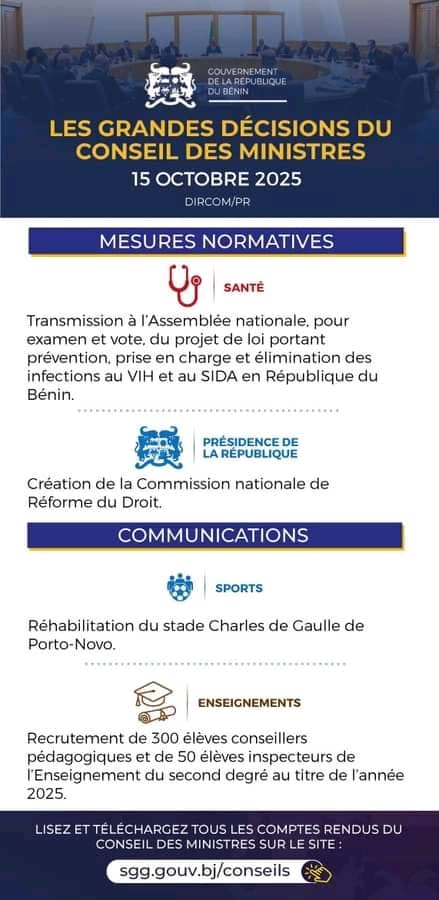 Lors du Conseil des ministres tenu ce mercredi 15 octobre 2025, le Gouvernement du Bénin a adopté plusieurs mesures d’envergure traduisant sa volonté de consolider les fondements juridiques et sociaux du pays. Parmi les décisions phares figurent la transmission à l’Assemblée nationale du projet de loi relatif à la prévention et à la prise en charge du VIH/SIDA, ainsi que la création d’une Commission nationale de Réforme du Droit, destinée à moderniser et harmoniser le cadre législatif national.