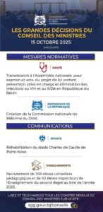 Sur le plan sectoriel, l’exécutif béninois a approuvé la réhabilitation du stade Charles de Gaulle de Porto-Novo, symbole du patrimoine sportif national, et a autorisé le recrutement de 300 élèves conseillers pédagogiques et de 50 élèves inspecteurs pour l’enseignement secondaire. Ces décisions illustrent la détermination du Gouvernement à investir simultanément dans la jeunesse, l’éducation et les infrastructures sportives, gages d’un développement durable et inclusif.