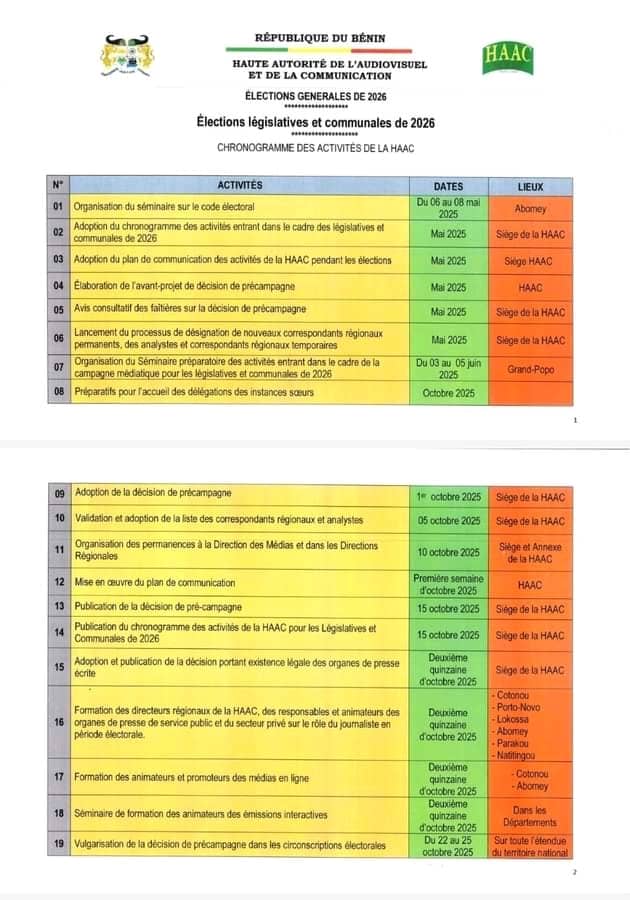 La Haute Autorité de l’Audiovisuel et de la Communication (HAAC) du Bénin a rendu publique, ce mercredi 15 octobre 2025, la Décision N°25-067/HAAC du 1er octobre 2025, fixant les règles applicables aux médias durant la période de précampagne des élections législatives et communales du 11 janvier 2026. Couvrant la période du 8 octobre au 26 décembre 2025, cette décision vise à garantir un traitement équitable, équilibré et professionnel de l’information politique avant l’ouverture officielle de la campagne électorale.