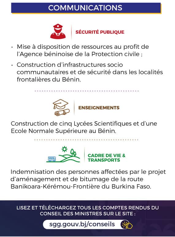 Sur le plan socio-économique, le gouvernement a autorisé la construction de cinq lycées scientifiques et d’une École normale supérieure afin de renforcer la formation technique et professionnelle. Des mesures d’appui à la Protection civile et à la sécurité des zones frontalières ont également été validées, de même que l’indemnisation des populations touchées par les travaux routiers à Banikoara. Enfin, plusieurs nominations ont été prononcées au ministère du Travail et de la Fonction publique, traduisant la volonté de l’exécutif d’insuffler un nouvel élan à l’administration publique.