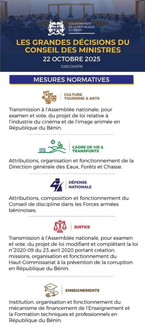 Le Conseil des ministres réuni ce mercredi 22 octobre 2025 sous la présidence du chef de l’État, Patrice Talon, a entériné une série de décisions majeures touchant divers secteurs stratégiques. Parmi les mesures phares, figure la transmission à l’Assemblée nationale du projet de loi sur l’industrie du cinéma et de l’image animée, marquant une étape décisive dans la structuration du secteur culturel béninois. Le Conseil a également adopté de nouveaux textes relatifs à l’organisation des Forces armées béninoises, à la Direction générale des Eaux, Forêts et Chasse, ainsi qu’à la réforme du Haut-Commissariat à la prévention de la corruption.
