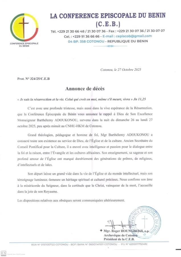 À Rome comme en Afrique, Monseigneur Adoukonou a incarné le visage d’une Église africaine enracinée dans sa culture et ouverte au dialogue universel. Son engagement au sein du Conseil pontifical pour la culture, ses travaux au service de la Commission théologique internationale et sa contribution au développement de la pensée chrétienne africaine resteront gravés dans la mémoire ecclésiale. Avec sa disparition, c’est un pilier de la foi, du savoir et du dialogue interculturel qui s’en va, laissant au Bénin et au monde catholique le souvenir d’un homme d’une exceptionnelle humilité et d’une grandeur d’âme incontestable.