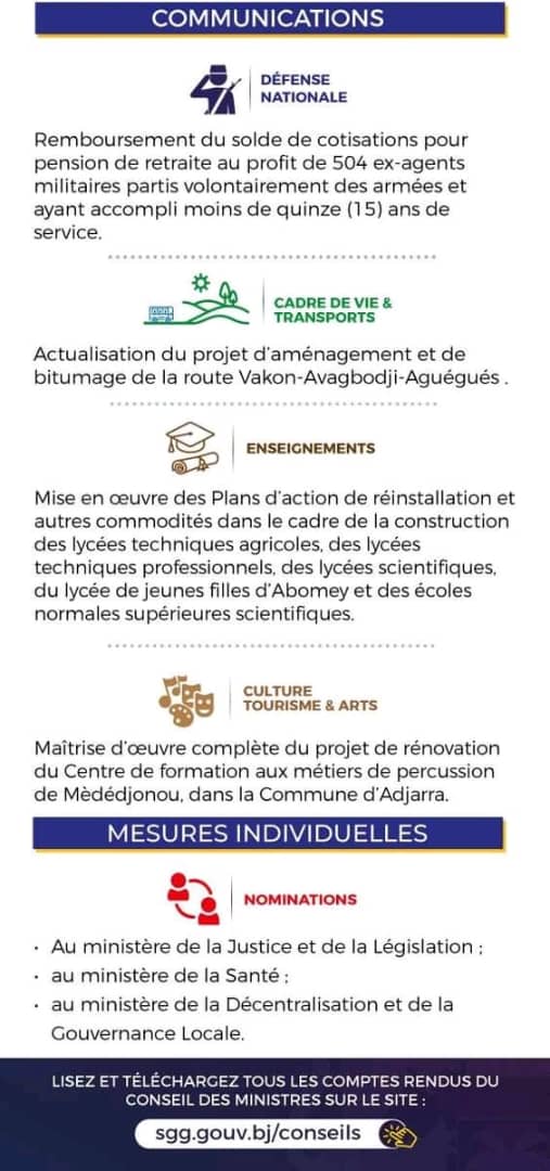 Les communications examinées ont mis en lumière des actions à fort impact social, notamment le remboursement des cotisations pour pension de retraite à plus de 500 ex-agents militaires, l’actualisation du projet d’aménagement de la route Vakon-Avagbodji-Aguégué et la poursuite des projets de construction de lycées techniques, scientifiques et agricoles sur tout le territoire. Le Conseil a en outre validé la rénovation du Centre de formation aux métiers de percussion de Mèdédjonou, témoignant d’une attention particulière portée au patrimoine culturel et à la formation artistique.