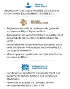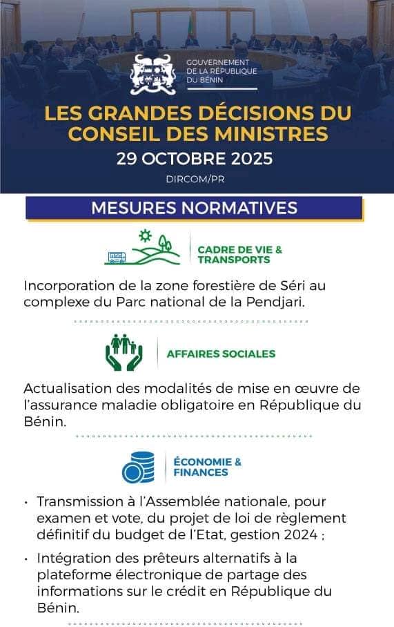 Au titre des mesures normatives, le Conseil a notamment approuvé l’incorporation de la zone forestière de Séri au complexe du Parc national de la Pendjari, actualisé les modalités de mise en œuvre de l’assurance maladie obligatoire et validé le projet de loi de règlement définitif du budget de l’État pour la gestion 2024. D’autres décisions portent sur la modernisation du secteur touristique à travers la réglementation du métier de guide, l’approbation d’une nomenclature des activités du tourisme et la mise en place d’un compte satellite dédié. Le gouvernement a également autorisé l’augmentation du capital social de la Société de Productions Audiovisuelles S.A. et approuvé les statuts modifiés de la SONEB S.A., signe d’une volonté affirmée de dynamiser les entreprises publiques.